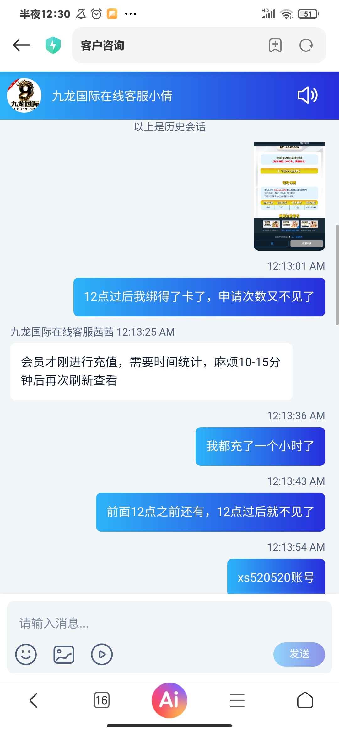 挂这种垃圾台子,早点下架吧 我11点多充的时候,然后申请次数的时候,他叫我过12点才能绑卡 然后12点过后绑得了卡了,又没有申请次数了,问他了,tmd这种态度 给狗狗都不玩,直接避雷